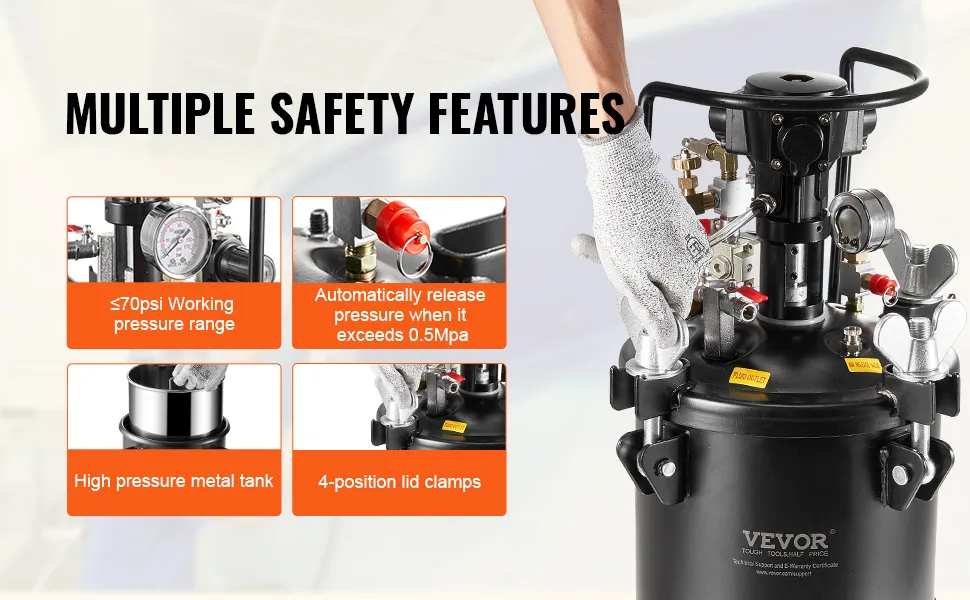 Upgraded Sealing Performance: The paint pressure pot features an inner lining and outer layer made of high-pressure resistant, impact-resistant metal steel. The bucket mouth is equipped with a rubber sealing ring and four secure sealing locks to ensure a tight closure. It also comes with leak repair sealant. Each unit undergoes a water tightness test before leaving the factory, ensuring no gas leakage issues.