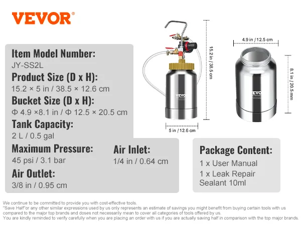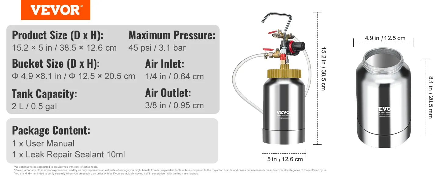 The pressure pot has a capacity of 2L/0.5gal with an inlet and outlet diameter of 1/4in and a fluid outlet diameter of 3/8in. It can accommodate more kinds of paints. The 4.1 lbs volume joint with 2 hoses is easy to carry, and start painting everywhere you go!