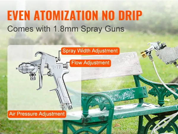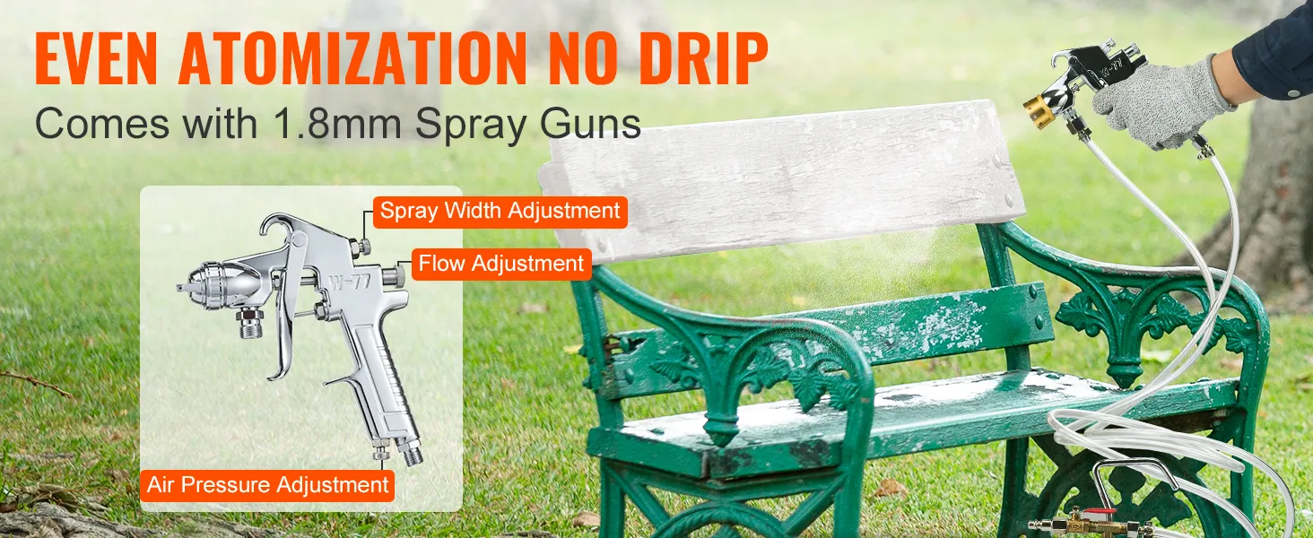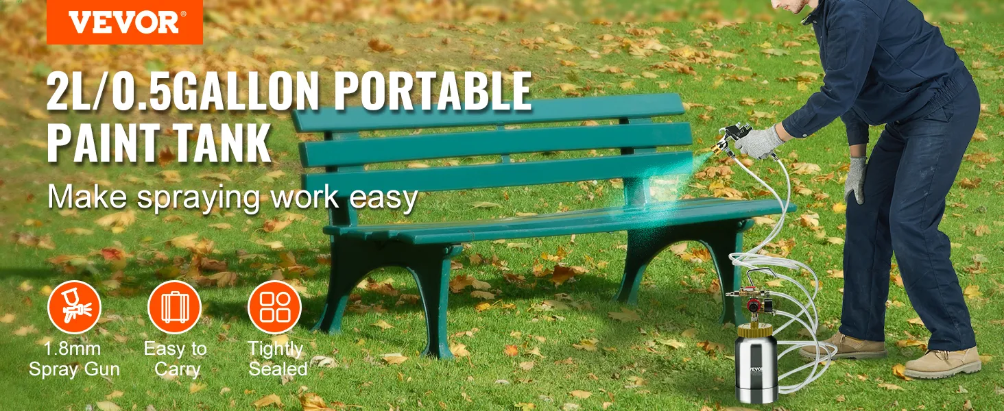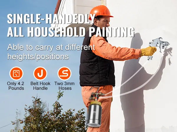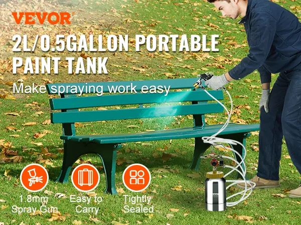 The VEVOR spray can features a 2L lightweight volume and 3m hoses fitting design that allows you to hang it from your waist for high-altitude painting work easily. The 1.8mm spray gun can be compatible with most paints and applied for home decoration painting work perfectly.