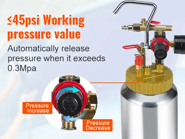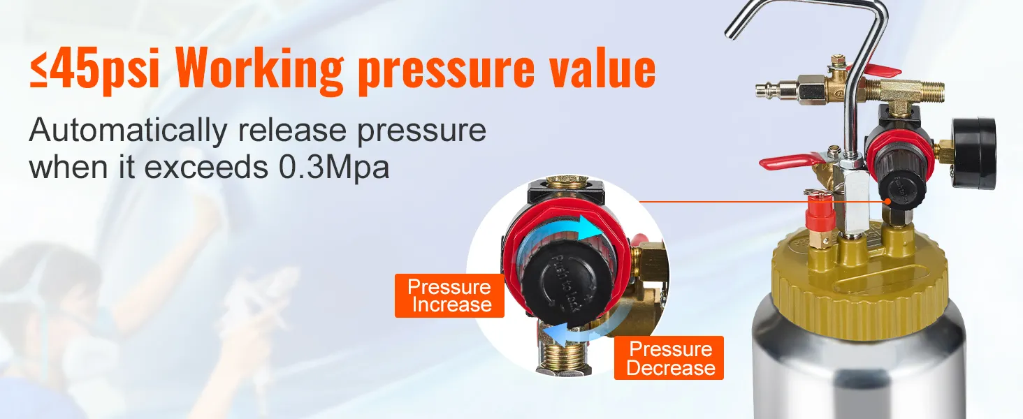 Adjustable Pressure: The paint tank pressure is adjustable with a maximum of 45psi. You can adjust it precisely with the pressure knob, and the accurate pressure gauge shows the real-time pressure. The safety valve of our pressure pot for painting automatically releases pressure when it exceeds 0.3Mpa to ensure secure operation.
