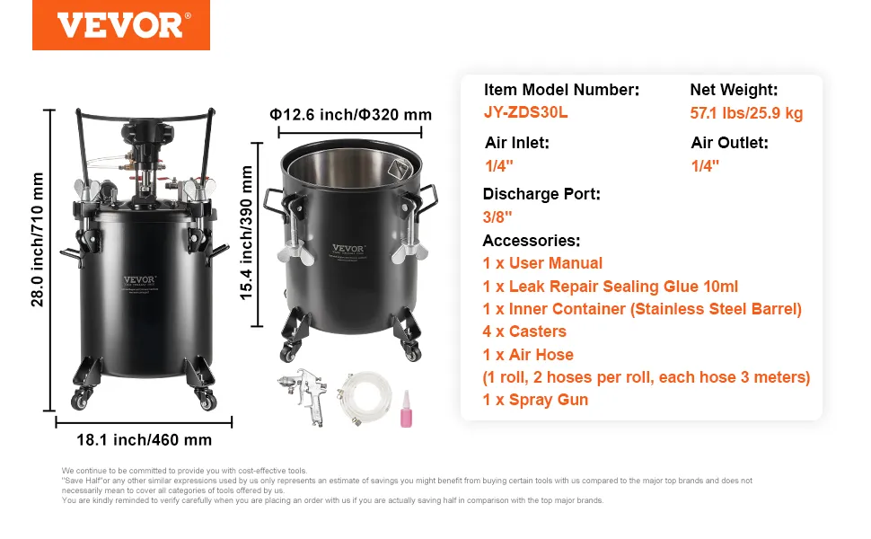 30L Large Capacity: The spray paint pressure pot tank has a 30 L/7.5 gal capacity, with inlet and a outlet diameters of 1/4" and fluid outlet diameter of 3/8". This extra-large capacity allows you to efficiently complete painting tasks for building exteriors, outdoor fences, boats, home decor, and more, without the need for frequent paint refills.