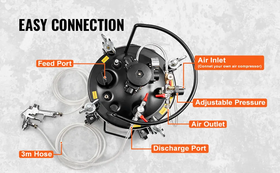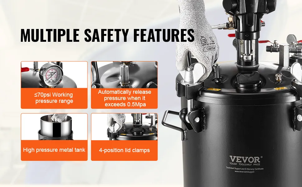 Upgraded Sealing Performance: The paint pressure pot features an inner lining and outer layer made of high-pressure resistant, impact-resistant metal steel. The bucket mouth is equipped with a rubber sealing ring and four secure sealing locks to ensure a tight closure. It also comes with leak repair sealant. Each unit undergoes a water tightness test before leaving the factory, ensuring no gas leakage issues.