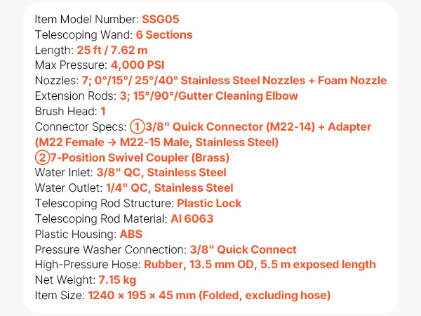 Versatile Cleaning Capabilities: This pressure washer wand extension includes a 7-position pivoting coupler for flexible multi-angle cleaning. It comes with 7 nozzles, 3 extension wands (15°, 90°, and gutter cleaner), and a brush head for varied tasks