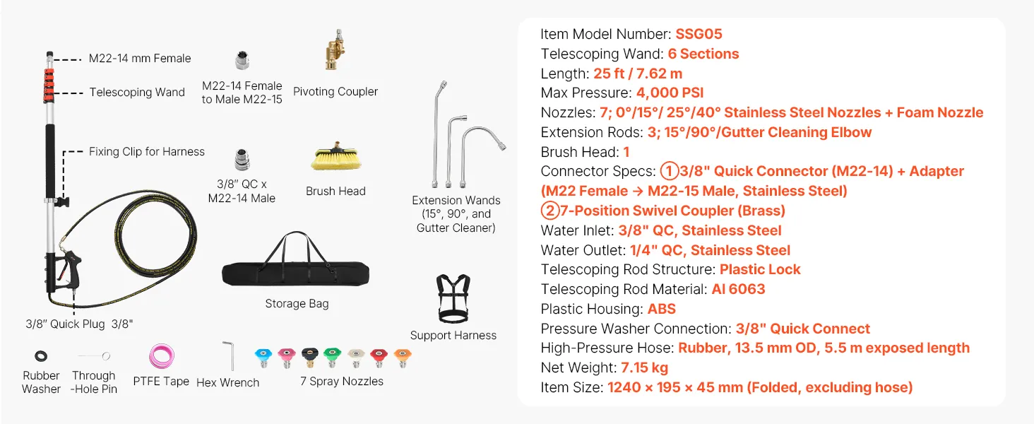 VEVOR 7.62 m Pressure Washer Telescoping Wand, with Power Washer Extension Wands & High Pressure Hose, Brush Head, 7 Nozzles, Hose Adapter, Support Belt, Storage Bag, 4000 PSI for High Cleaning