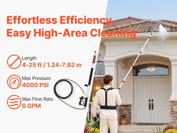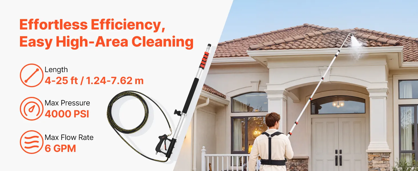 Effortless High Cleaning: This pressure washer extension pole is adjustable from 4 to 25 ft (1.24 to 7.62 m), allowing easy cleaning of high areas like roofs, gutters, walls, and windows without a ladder, which helps save time and effort during overhead cleaning
