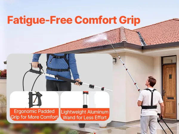 Upgraded Shoulder Straps: The power washer extension wand comes with padded, widened shoulder straps and an added chest strap to distribute weight evenly. An adjustable waist belt fits different body types, aluminum alloy buckles stay secure