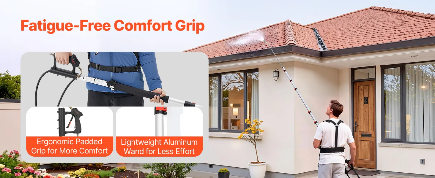 This telescoping pressure washer wand makes it easy to clean roofs, gutters, walls, and windows without a ladder, improving efficiency while reducing physical effort.