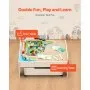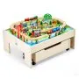 This 100-piece train table features a double-sided design: a colorful map for play and a smooth surface for learning. With sturdy wood construction, it holds up to 100lbs and includes a rolling storage drawer for easy organization.