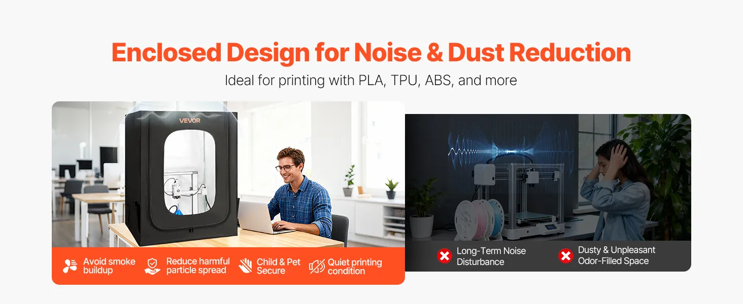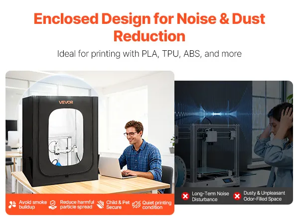 Noise Reduction: Featuring the fully enclosed structure, this large 3D printer enclosure isolates noise, reducing sound interference. It has left ventilation holes for optional fan installations, so you can install ventilation components (not included) to further reduce the smoke and dust buildup. It provides a cleaner working space, improving your work condition