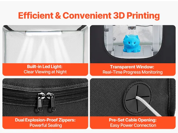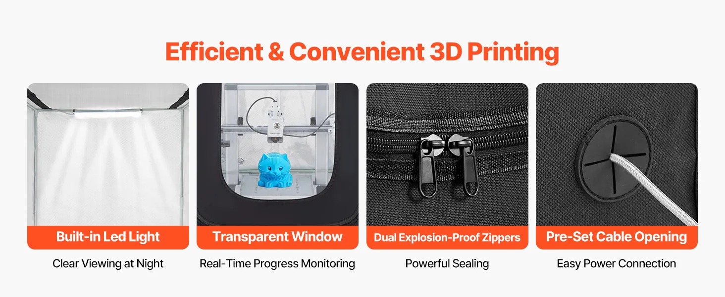 Our printer enclosure comes with a built-in LED light, making it easy to monitor the printing process even at night. The transparent window provides real-time visibility, while the zipper design allows effortless access. Reserved openings for power and data cables help keep the wiring neat.