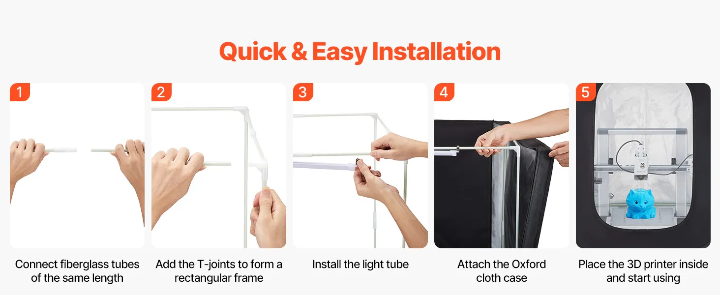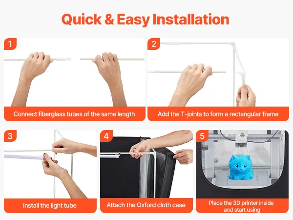 No extra tools are needed for assembly. This large 3D printer enclosure uses fiberglass tubes instead of conventional metal pipes, ensuring durability and resistance to aging and wear for long-term use.