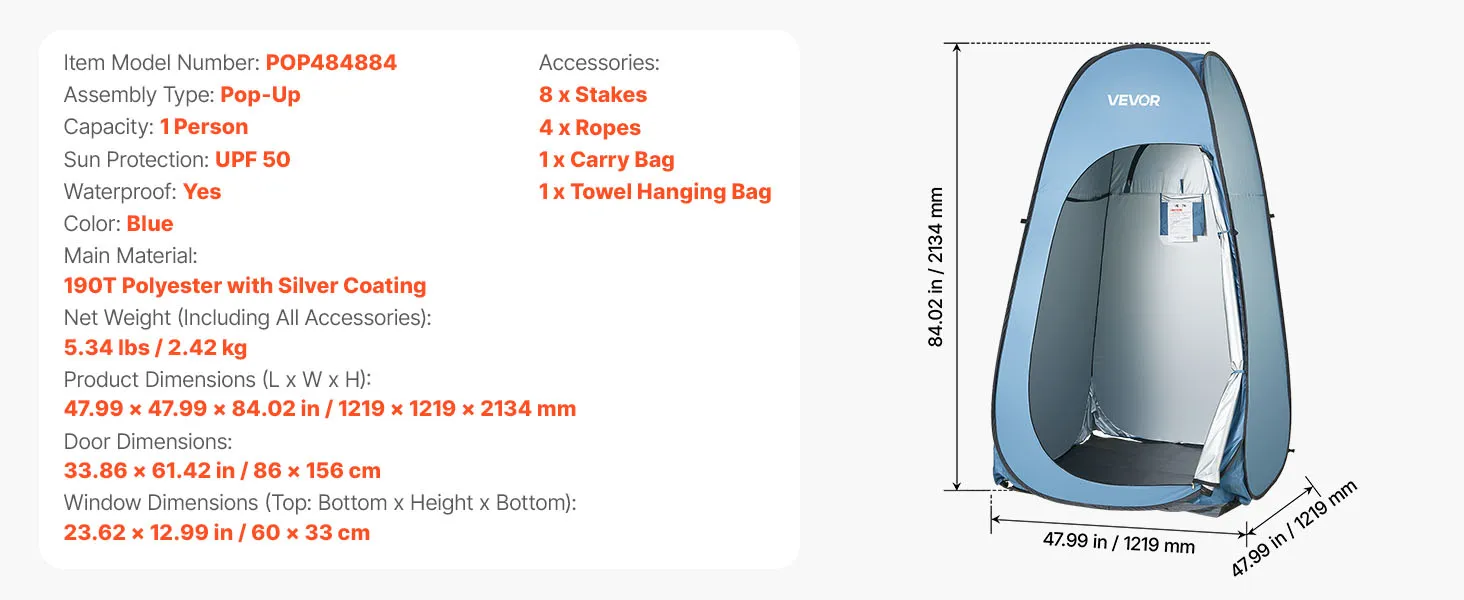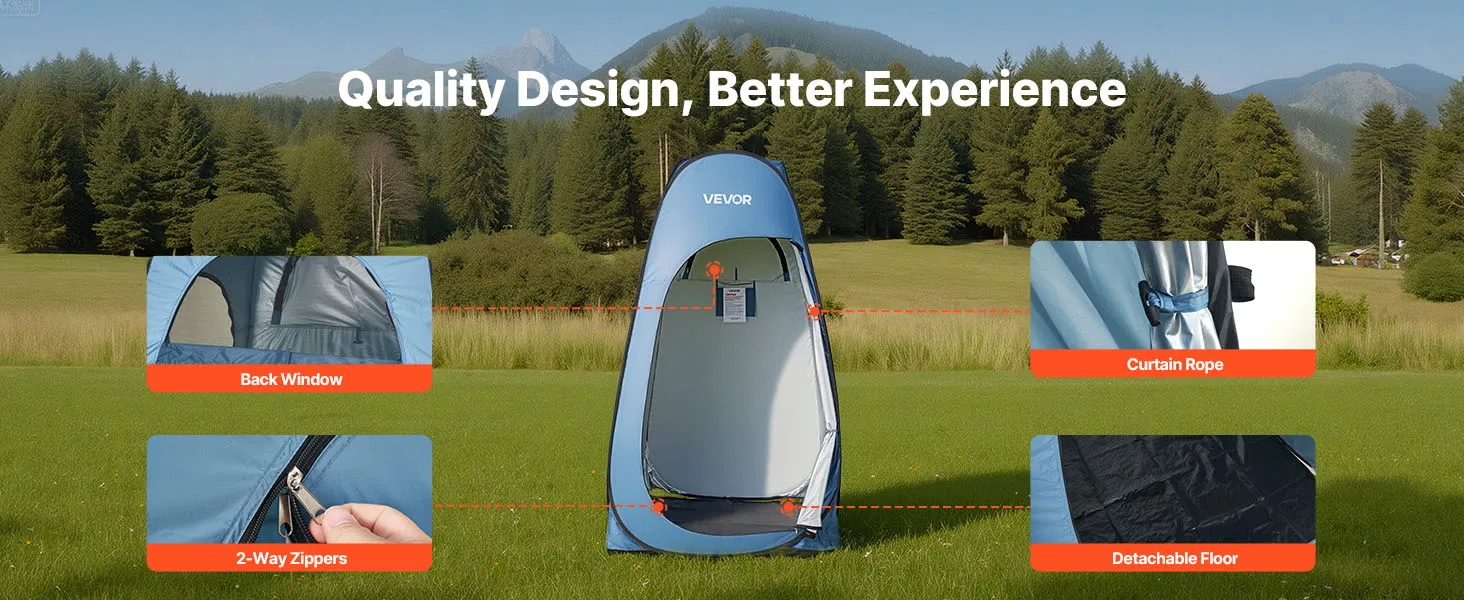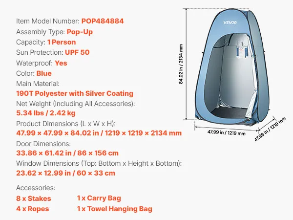 Multi-Functional Tent: The 47.99 x 47.99 x 84.02 in shower tent ensures ample space for showering. It delivers ventilation when used as a mobile toilet and serves as a private area for quick showers, restroom needs, or outfit changes