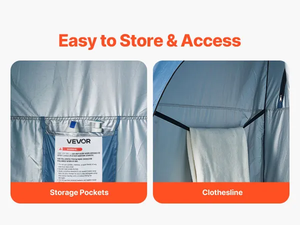 Multiple Storage Options: The built-in storage pocket of our privacy shower tent keeps phones, keys, and other small items organized and keeps them from getting scattered. The included clothesline makes it easy to hang wet towels or underwear