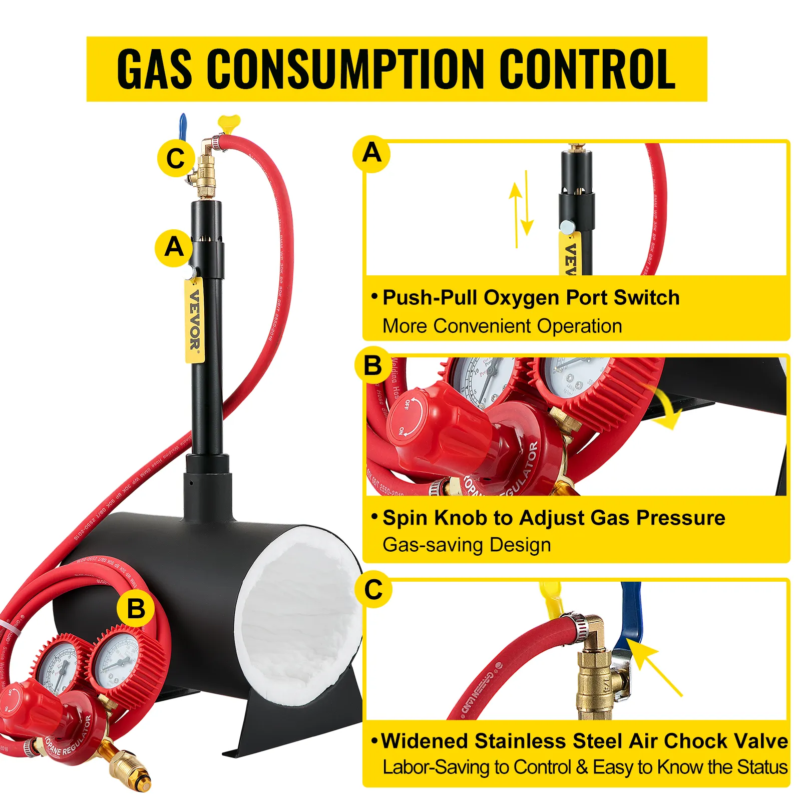Balance Right Temperature: This farrier forge can function by adjusting the gas pressure via spinning the knob on the gas pressure regulator. Additionally, the ball valve can switch the gas output independently. The push-pull oxygen port switch is convenient to operate.