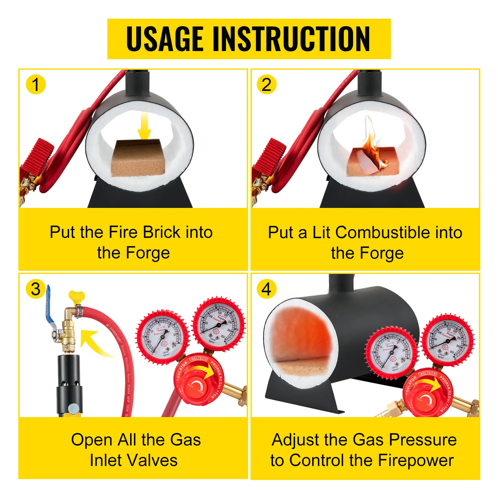 Steps for Usage: Here are some basic instructions for how to use this propane forge knife maker. Firstly, put the fire brick into the forge. Secondly, put a lit combustible into the forge. Then, open all the gas inlet valves. Finally, adjust the gas pressure to control the firepower depending on your need.