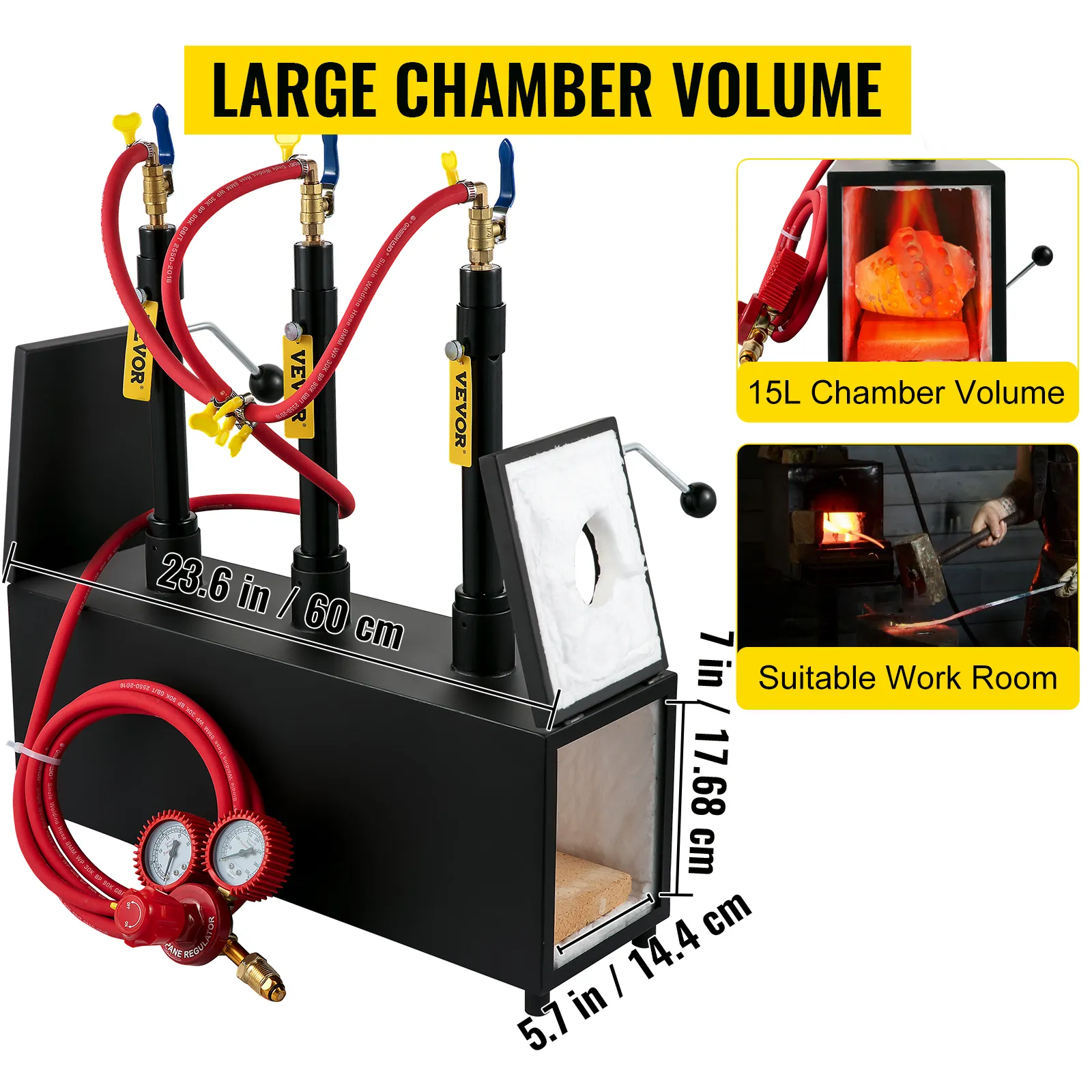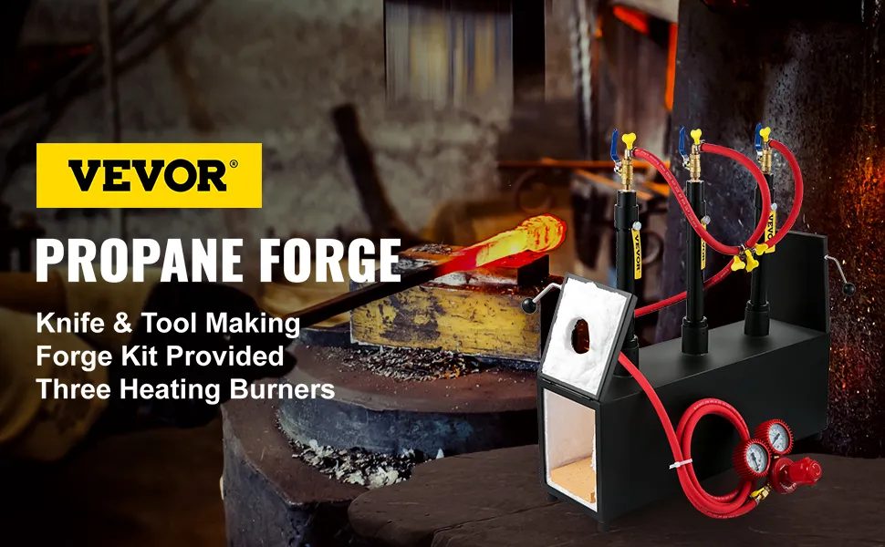 Blacksmithing Forge Kit: We provide a complete kit of forging accessories to fit our propane forge, including a pair of high-temperature gloves, a tong, 4 gas hoses, a gas pressure regulator, 3 refractory bricks, a support frame, 3 burners, 8 throat hoops, 1 PTFE tape, 3 air chocks, a cross, and 2 handles. You can create your blacksmithing works at will.