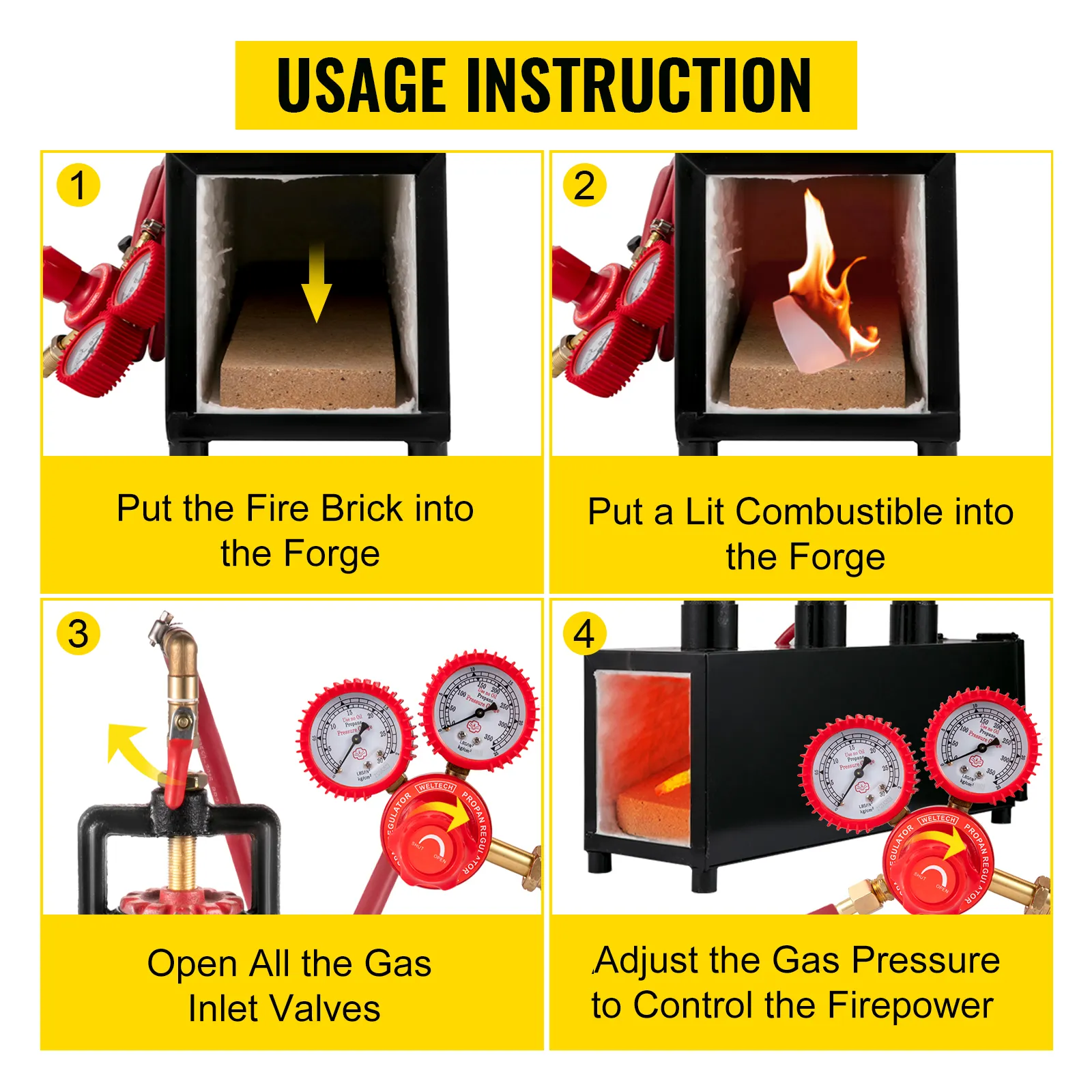 Steps for Usage: Here are some basic instructions for how to use this propane forge knife maker. Firstly, put the fire brick into the forge. Secondly, put a lit combustible into the forge. Then, open all the gas inlet valves. Finally, adjust the gas pressure to control the firepower depending on your need.