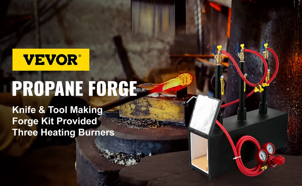 Blacksmithing Forge Kit: We provide a complete kit of forging accessories to fit our propane forge, including a pair of high-temperature gloves, a tong, 4 gas hoses, a gas pressure regulator, 3 refractory bricks, a support frame, 3 burners, 8 throat hoops, 1 PTFE tape, 3 air chocks, a cross, and a handle. You can create your blacksmithing works at will.