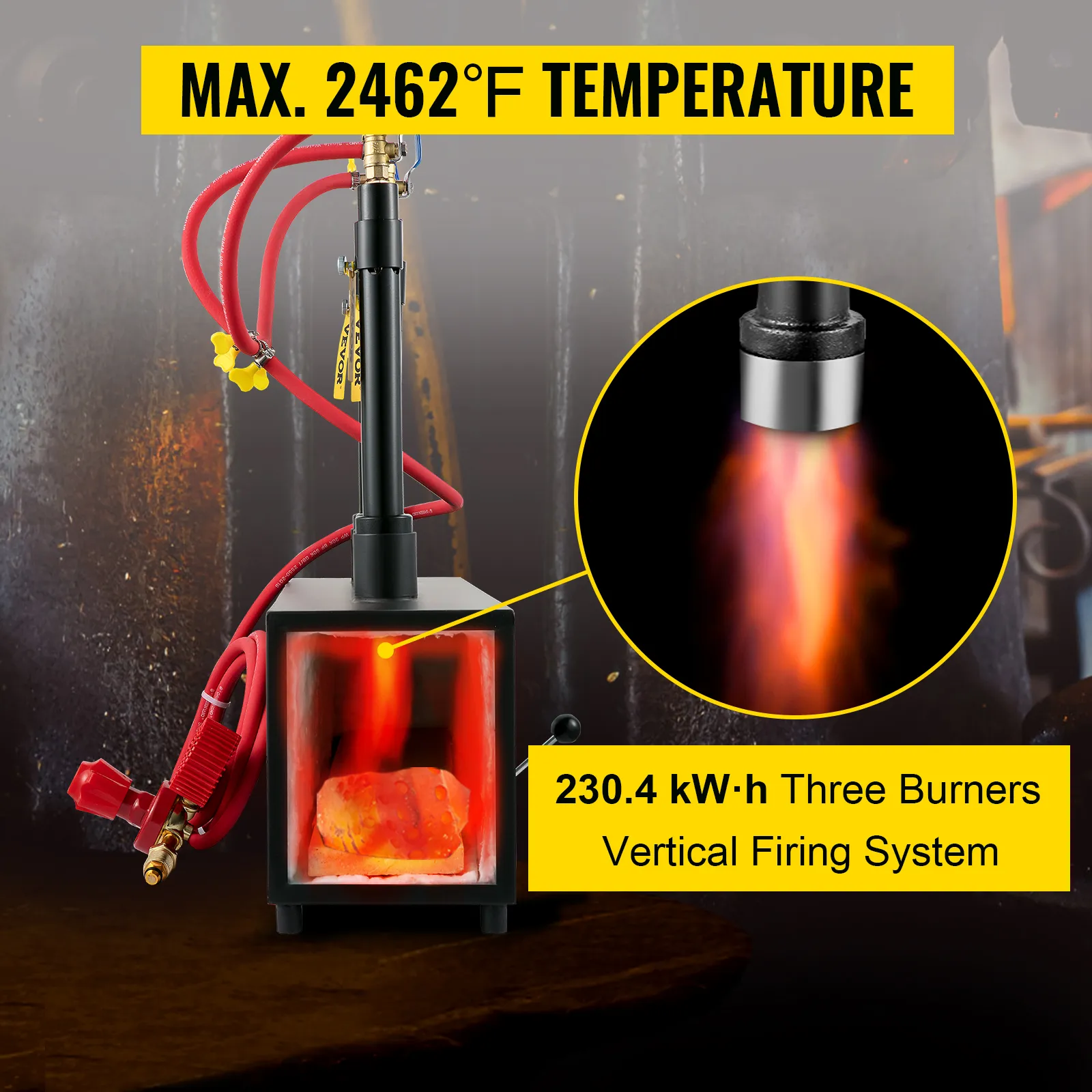 Our propane knife forge is built for your forging. Approximate Maximum Heating Temperature: 2462℉ / 1350℃, enough for forging metals. Our vertically designed firing system maximizes heating efficiency on our 230.4 kW·h / 786k BTU burner.
