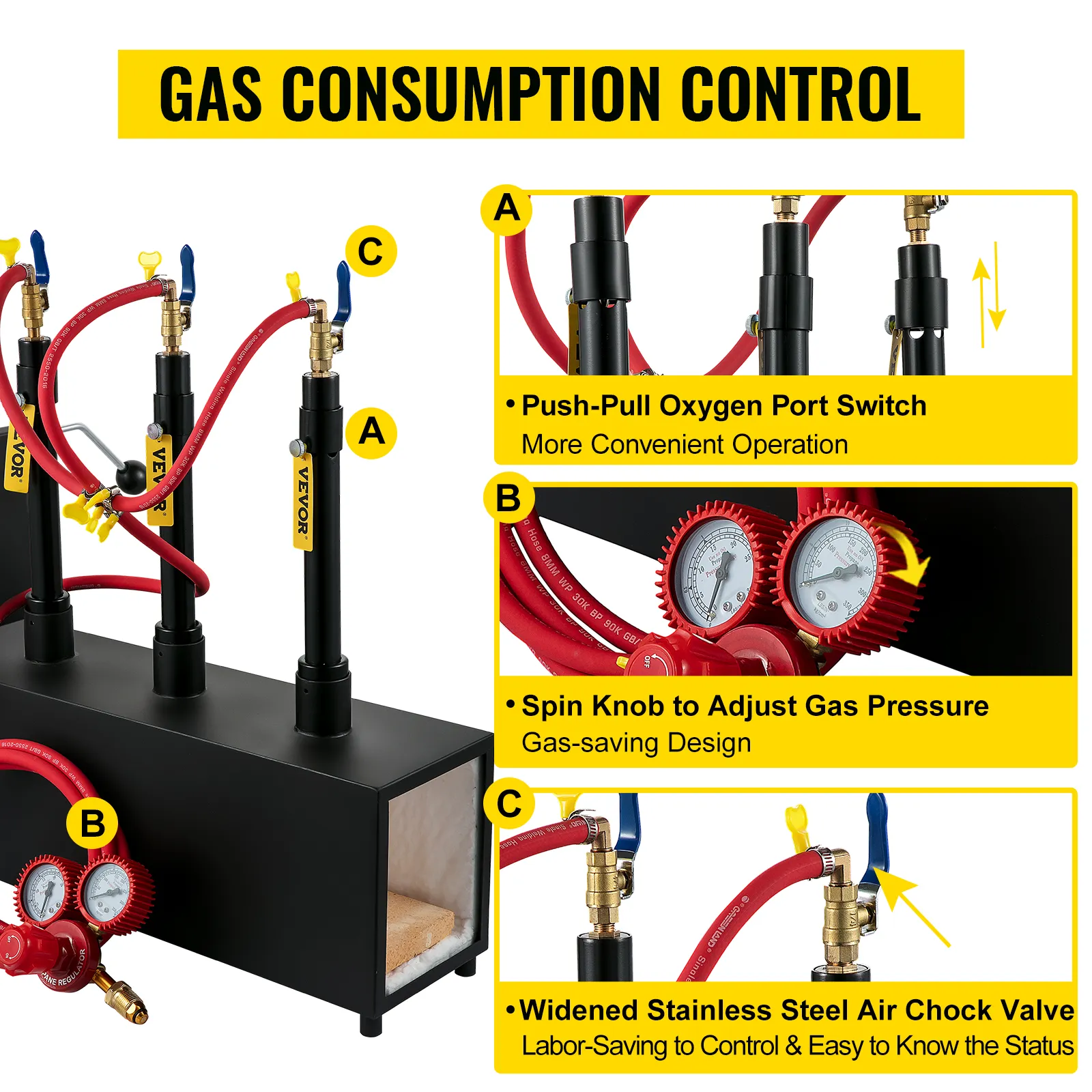 Balance Right Temperature: This farrier forge can function by adjusting the gas pressure via spinning the knob on the gas pressure regulator. Additionally, the ball valve can switch the gas output independently. The push-pull oxygen port switch is convenient to operate.