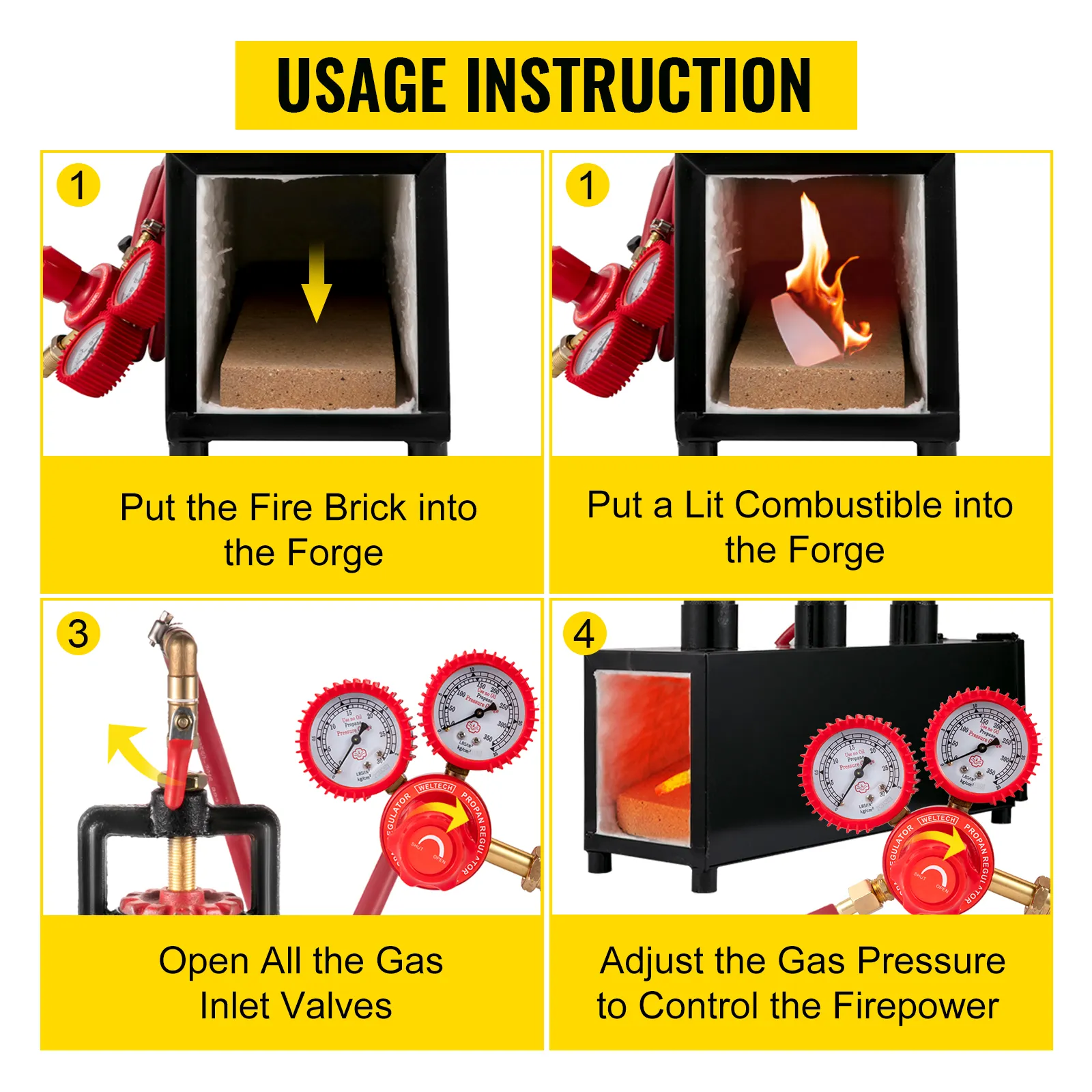 Steps for Usage: Here are some basic instructions for how to use this propane forge knife maker. Firstly, put the fire brick into the forge. Secondly, put a lit combustible into the forge. Then, open all the gas inlet valves. Finally, adjust the gas pressure to control the firepower depending on your need.