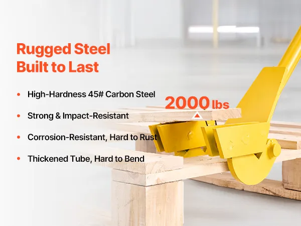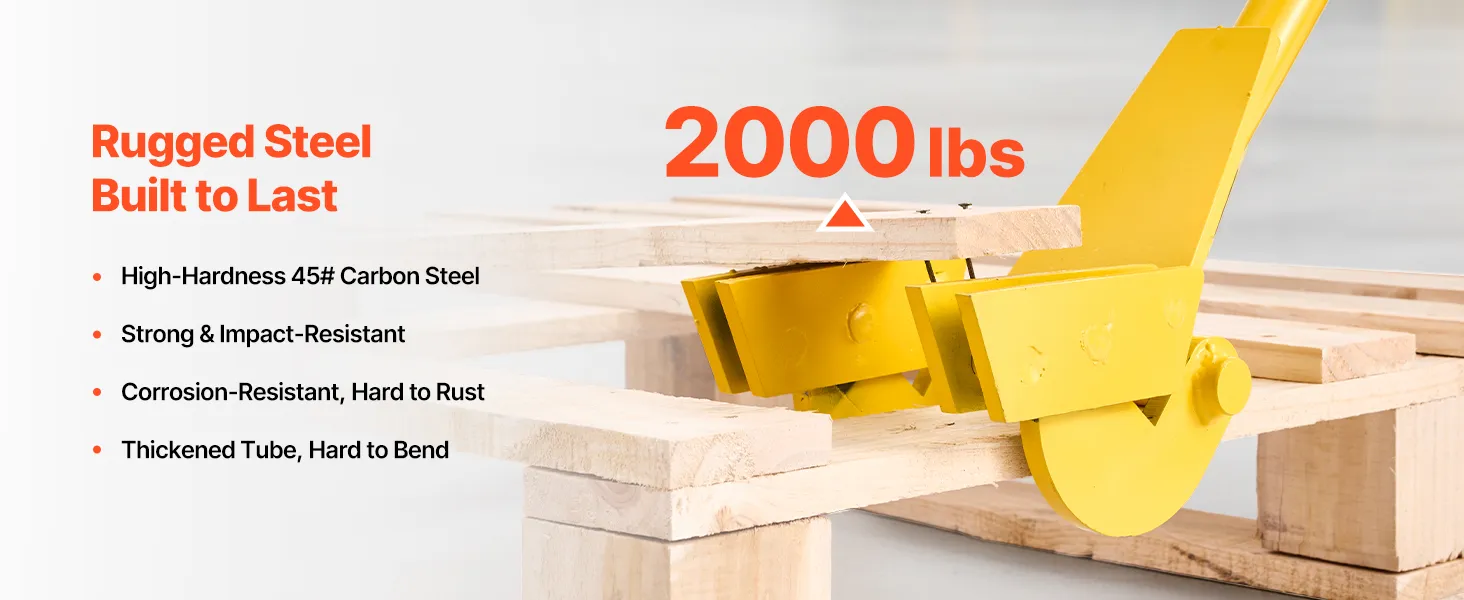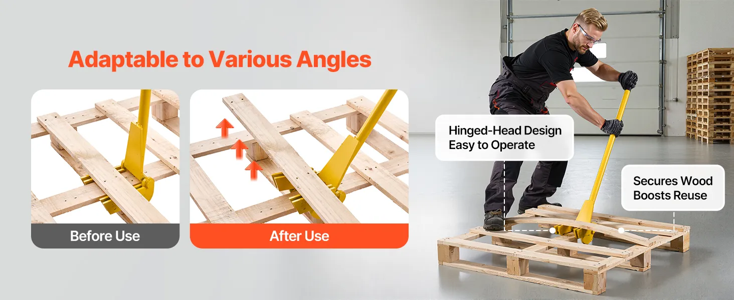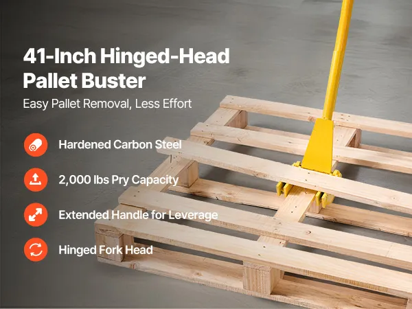Slip into pallet gaps for fast teardown—less time, less effort, fewer broken boards. Heat-treated 45# carbon steel delivers up to 2,000 lb prying power. Universal fit needs no installation. The extended, ergonomic handle reduces bending and boosts comfort and efficiency.
