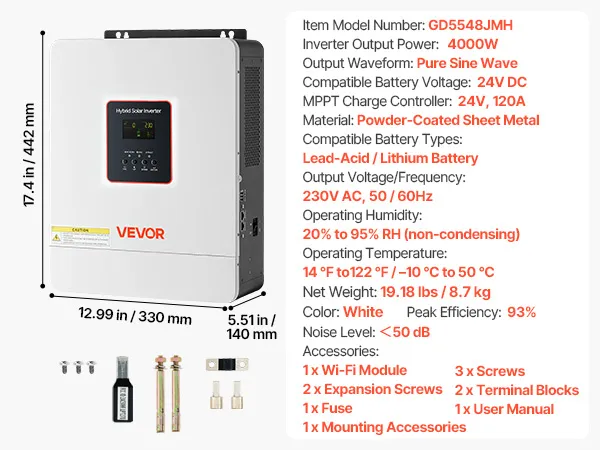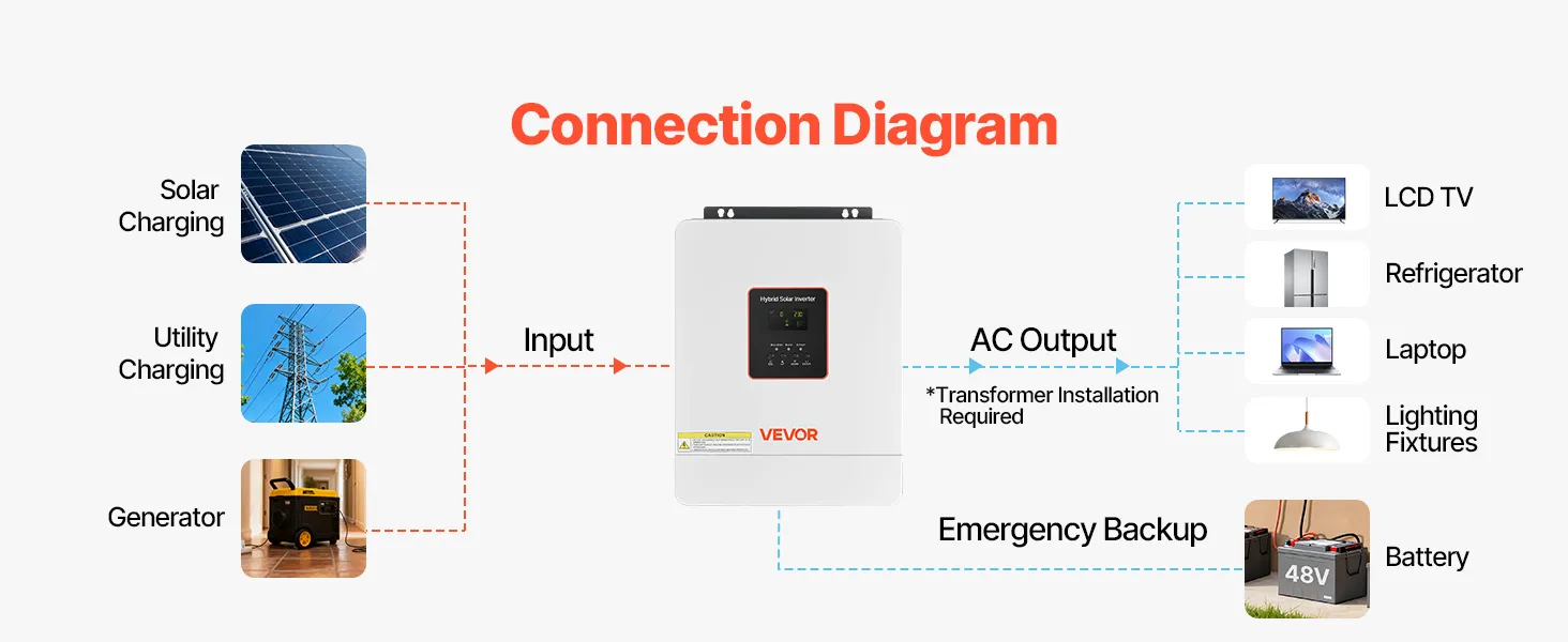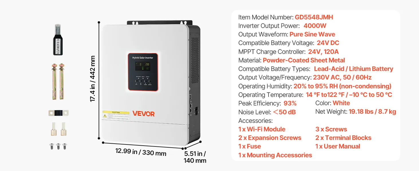 2-in-1 Hybrid Solar Inverter: Seamlessly integrates the inverter and controller in one unit. Delivers 4000W, 230V AC single-phase pure sine wave output, making it ideal for medium-sized homes and off-grid solar systems. For appliances requiring other voltages, a transformer is required (not included)