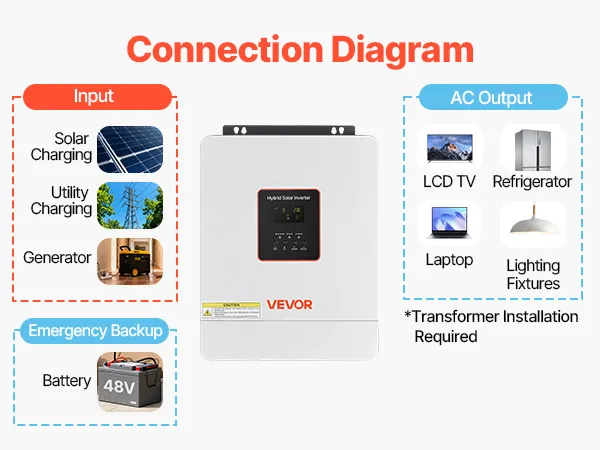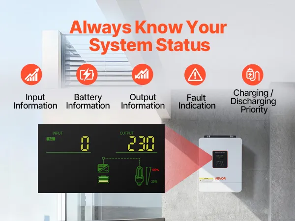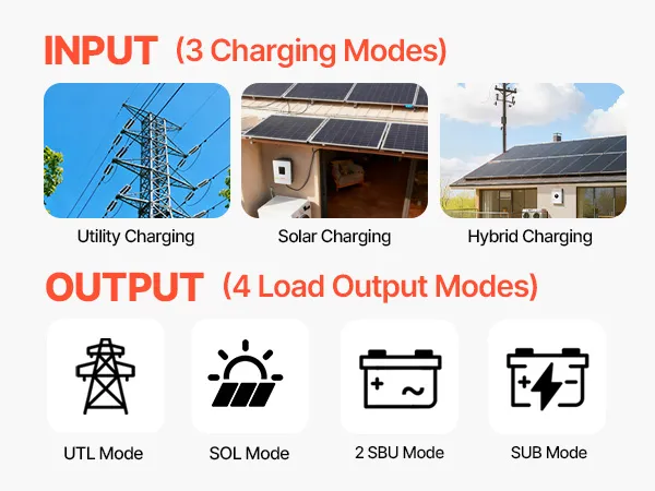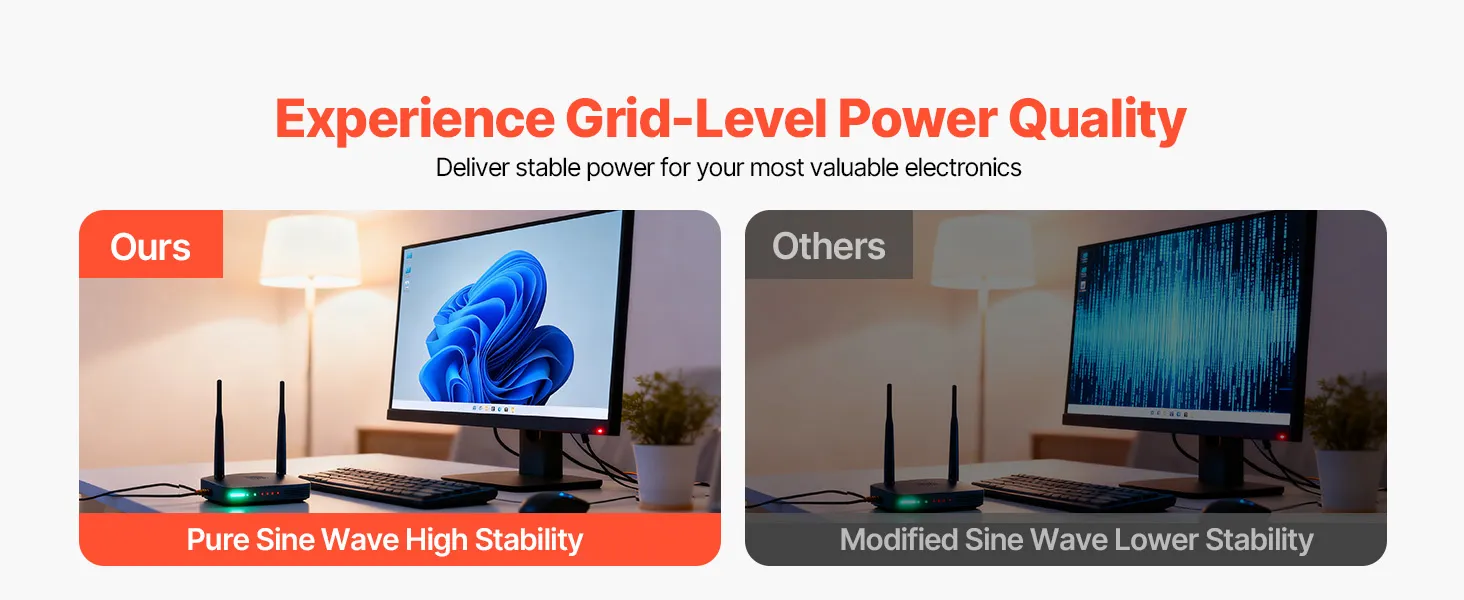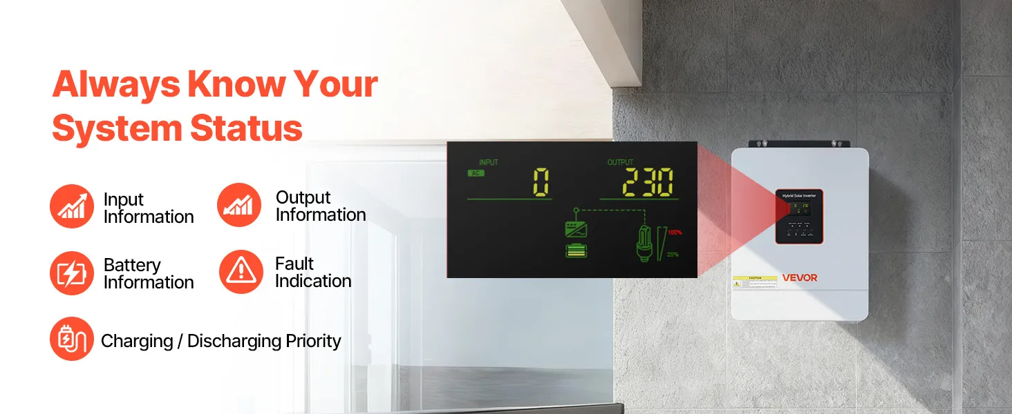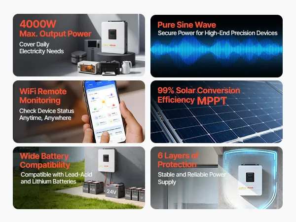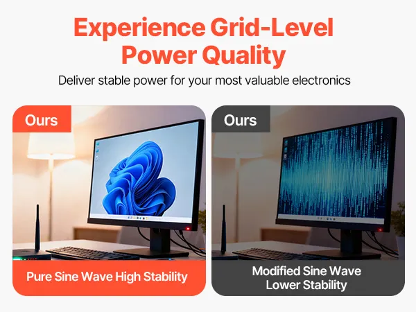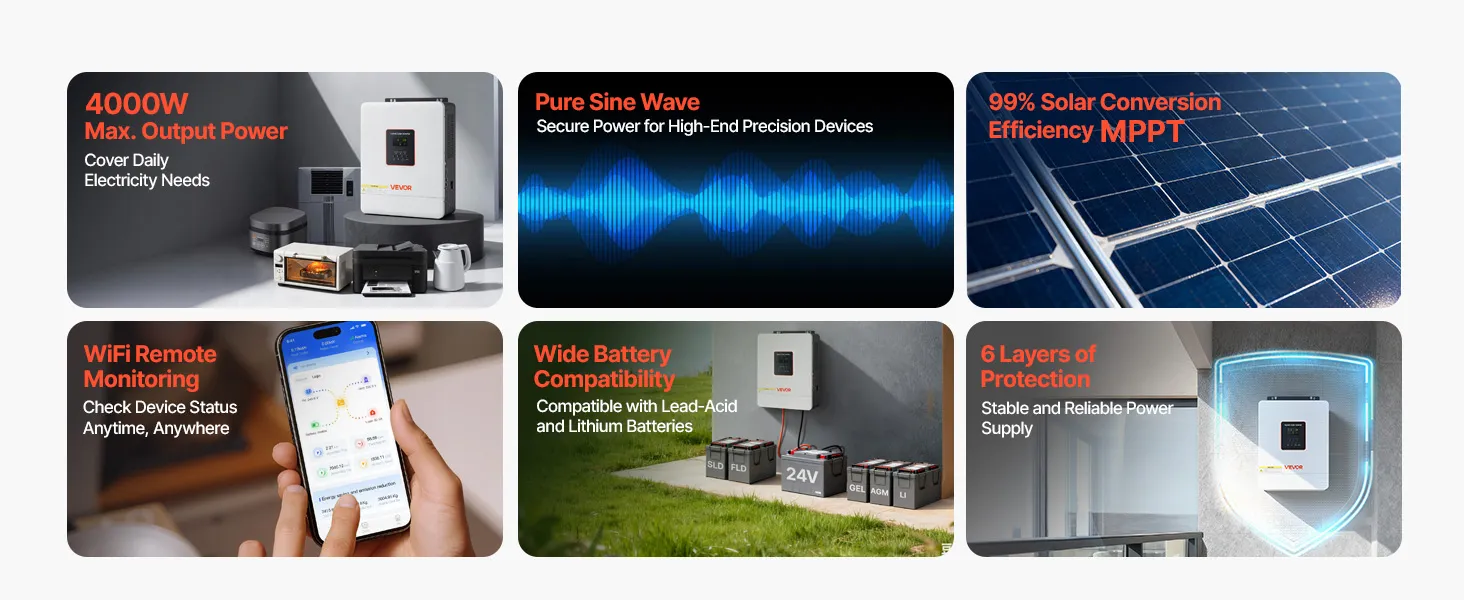 Pure Sine Wave Output: Enjoy utility-quality electricity for your voltage-sensitive precision electronics. With a pure sine wave output, our hybrid inverter charger ensures stable and secure operation for various home appliances, such as computers and TVs
