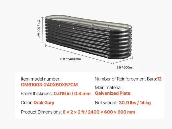 VEVOR Metal Raised Garden Bed, 2.4 x 0.6 x 0.6 m Oval Outdoor Galvanized Planter Garden Box, Open Bottom Design, Large Planter Raised Bed for Growing Vegetables, Flowers, Herbs, Succulents, Dark Gray