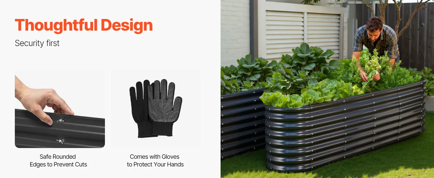 Secure to Use: Our raised planter box features rolled edges and rounded corners to reduce the chance of injury during use. It also comes with a pair of gloves to minimize hand scratches, allowing you to enjoy a smooth gardening experience