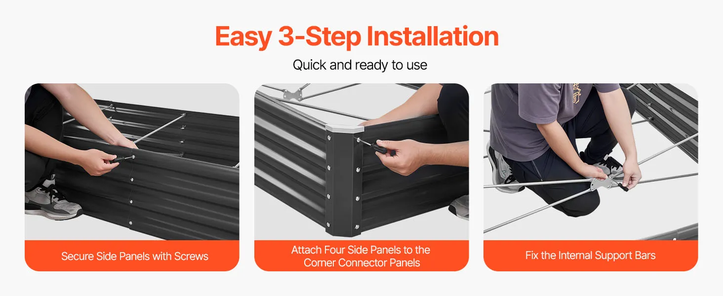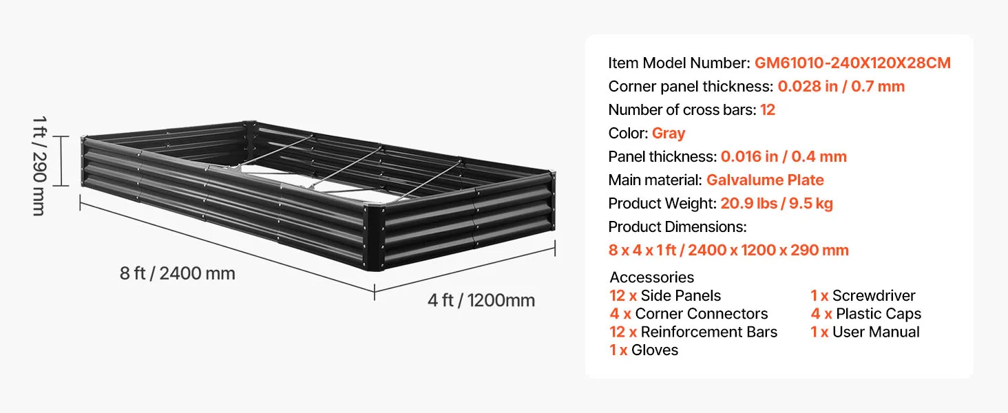What You'll Get: Our raised garden bed includes 12 side panels, 4 corner panels, 12 cross bars, 4 plastic caps, 1 set of hardware, and 1 user manual