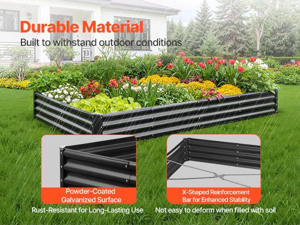 Sturdy and Reliable: Made with 0.4 mm metal side panels and 0.7 mm corner connectors, this metal raised garden bed features a galvanized powder-coated surface for rust resistance. The 12 internal X-shaped bars add stability and avoid toppling in winds
