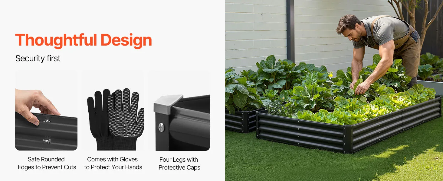 Secure to Use: Our raised planter box features rolled edges and rounded corners to reduce the chance of injury during use. It also comes with a pair of gloves to minimize hand scratches, allowing you to enjoy a smooth gardening experience