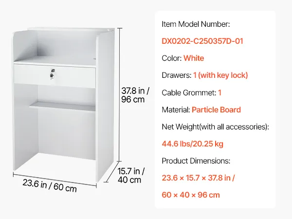 VEVOR Reception Desk, 60 cm Rectangular Front Counter Table, Modern Office Reception Desk with Drawer, Small Minimalist Retail Counter Table for Checkout, Lobby, Beauty Salon and Office, White