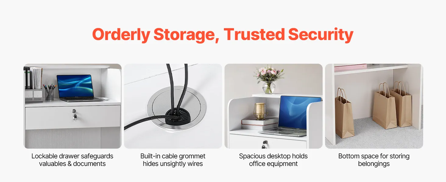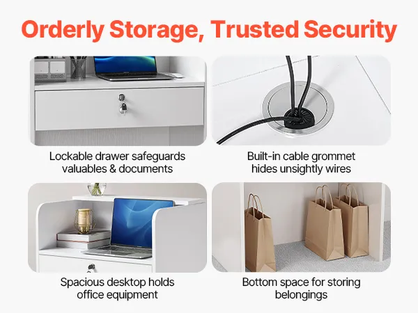 Security & Privacy: With a roomy surface for computers and daily tools, this reception counter table features high side panels for privacy. The lockable drawer keeps valuables secure, and the lower compartment provides concealed storage for personal items