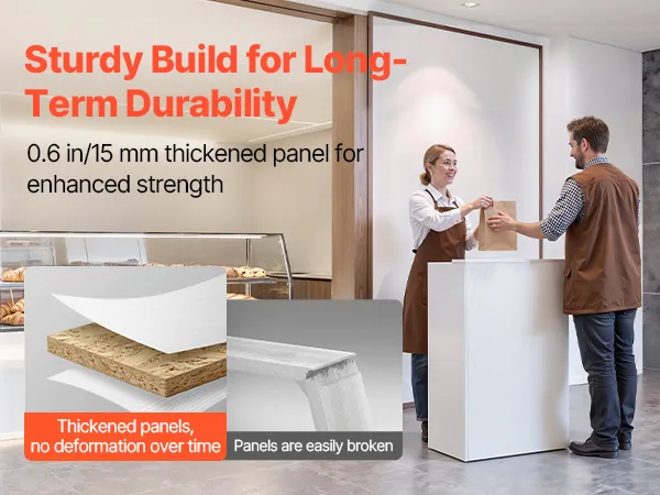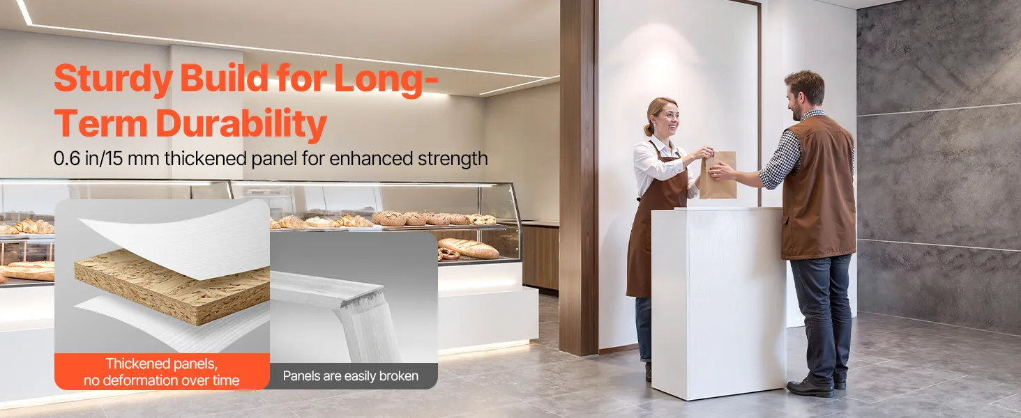 Sturdy & Durable: Built with 0.6 in (15 mm) thick particleboard, this white reception desk comes with smooth edges for security. The melamine surface is durable and dampness-proof, while tight panel joints and leveling feet enhance stability and lifespan