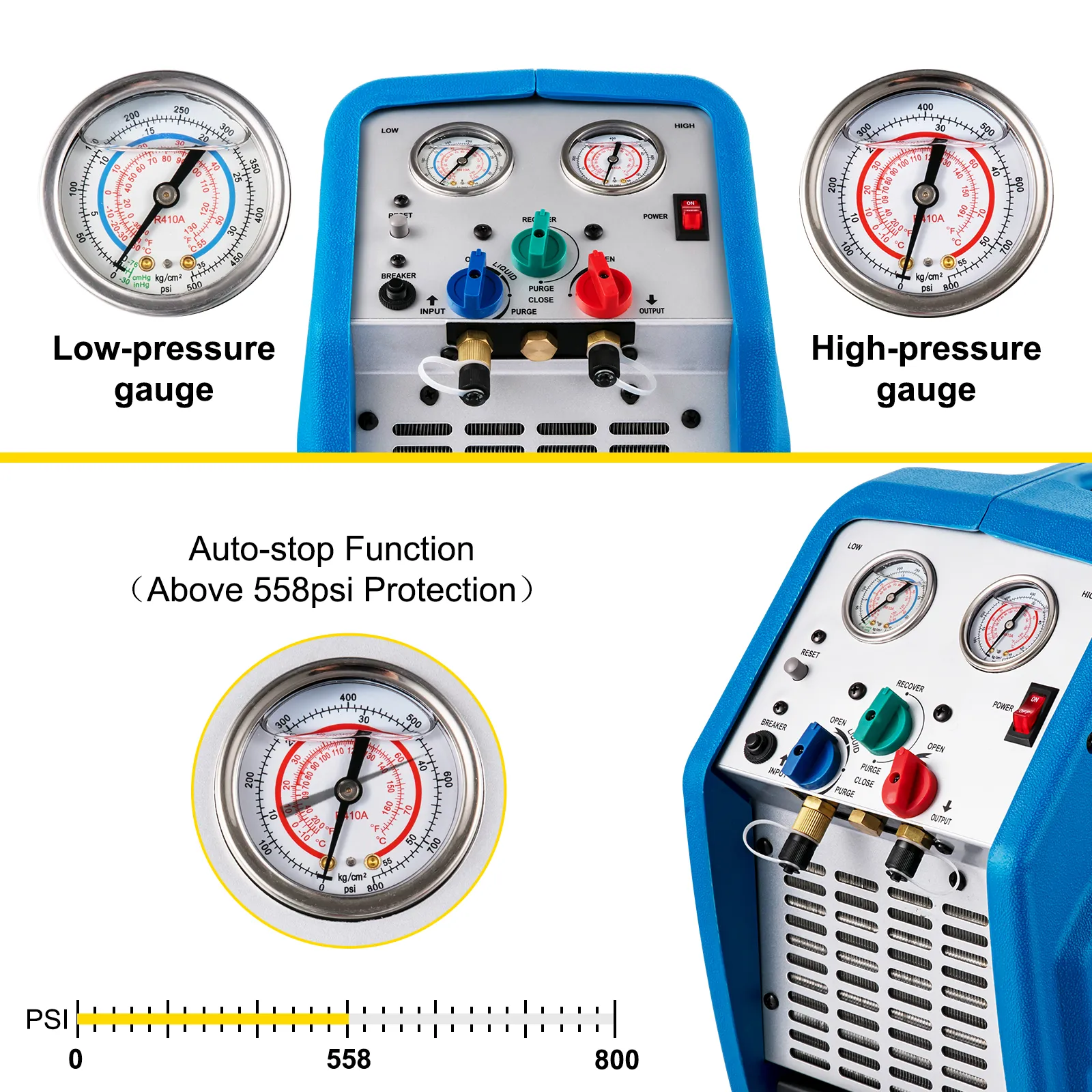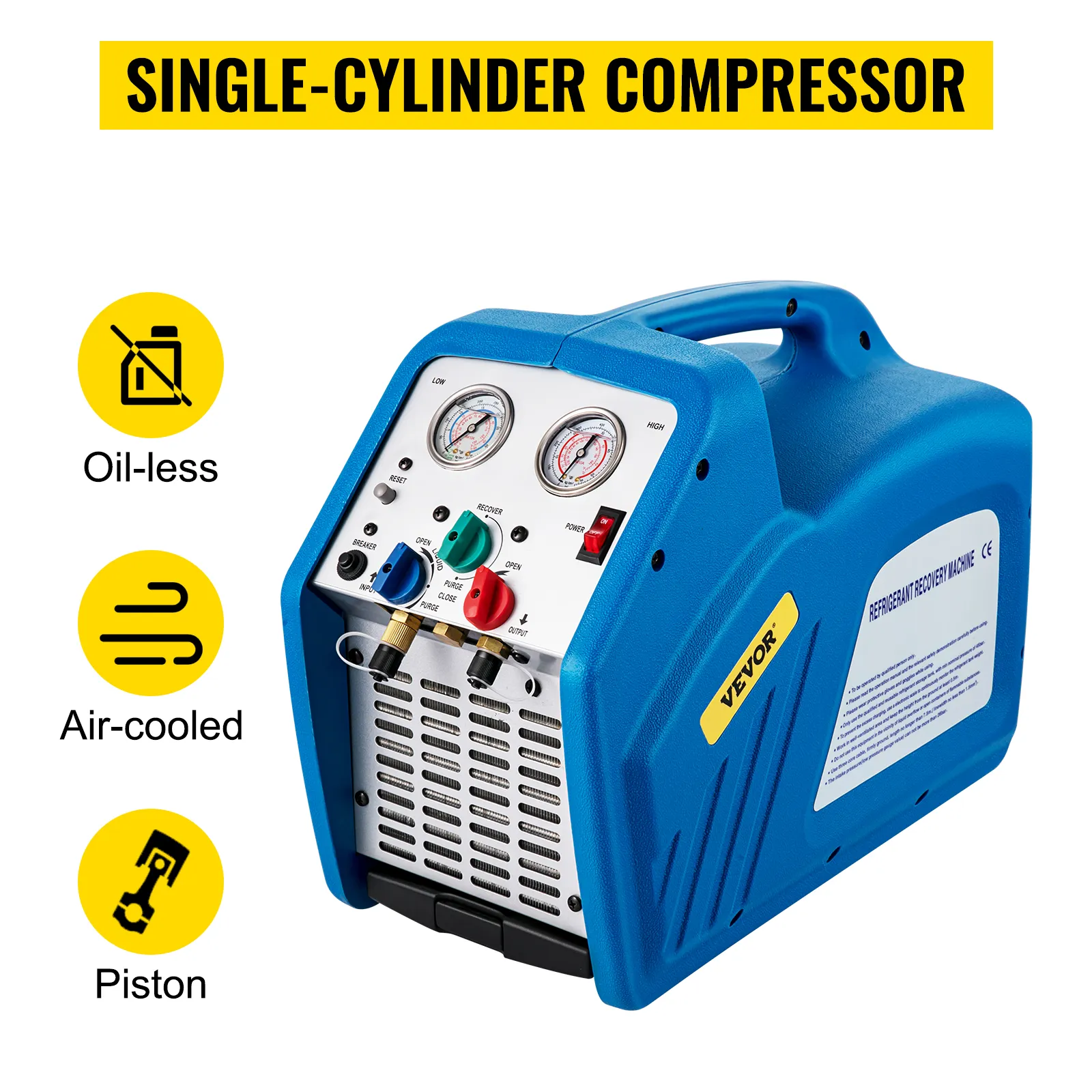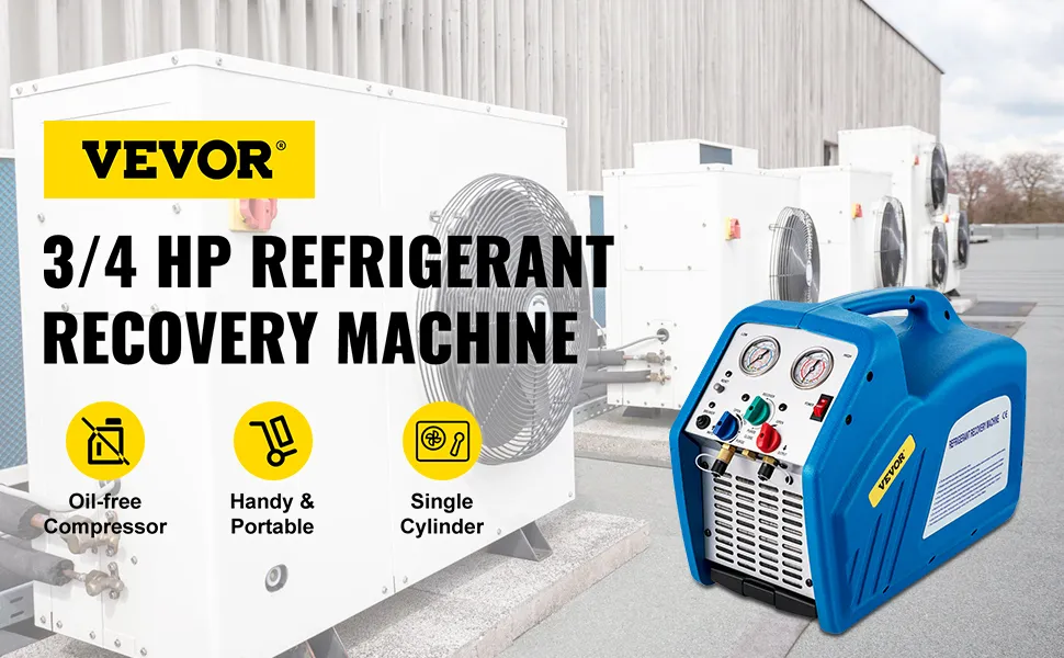 220V-240V 50 HZ-60 HZ, 3/4HP single-cylinder oil-less compressor with 1750 rpm can recycle all kinds of refrigerant, help you finish the work faster.