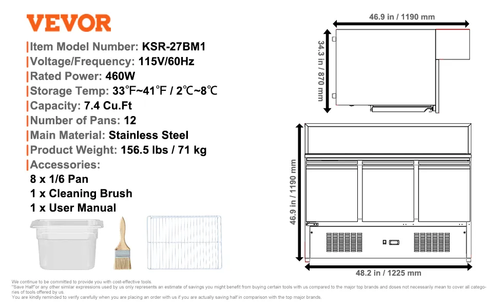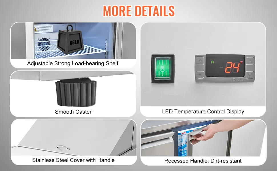 Use with Peace of Mind: This sandwich prep table is designed with security in mind, featuring overload protection that automatically shuts down the unit during abnormal use. The insulated button design significantly reduces the risk of electric shock. Additionally, the large heat dissipation grille at the bottom ensures rapid cooling, keeping the machine running efficiently.
