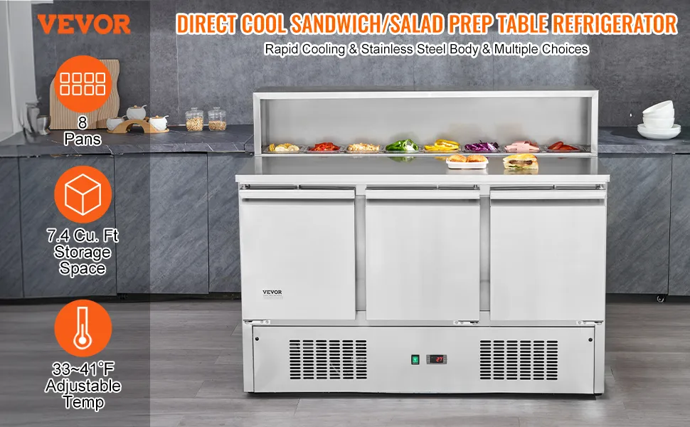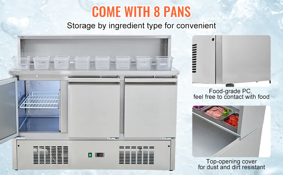 Spacious Work Surface: The thickened work surface provides ample space for making sandwiches and 14-inch pizzas. The open shelving includes 8 x 1/6 pans, made of food-grade PC material that is easy to clean.