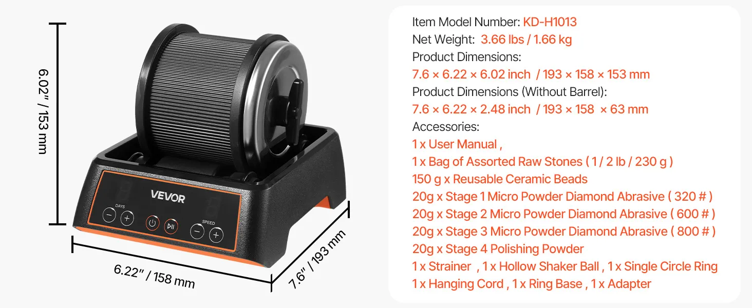 Complete Accessory Set: VEVOR stone polisher kit provides all necessary accessories, including raw stones, ceramic grit, micro diamond powder, polishing enhancer, strainer, shaker ball, rings, cords, and adapters. Perfect for home crafting or family projects, it brings rough stones to shining gems easily