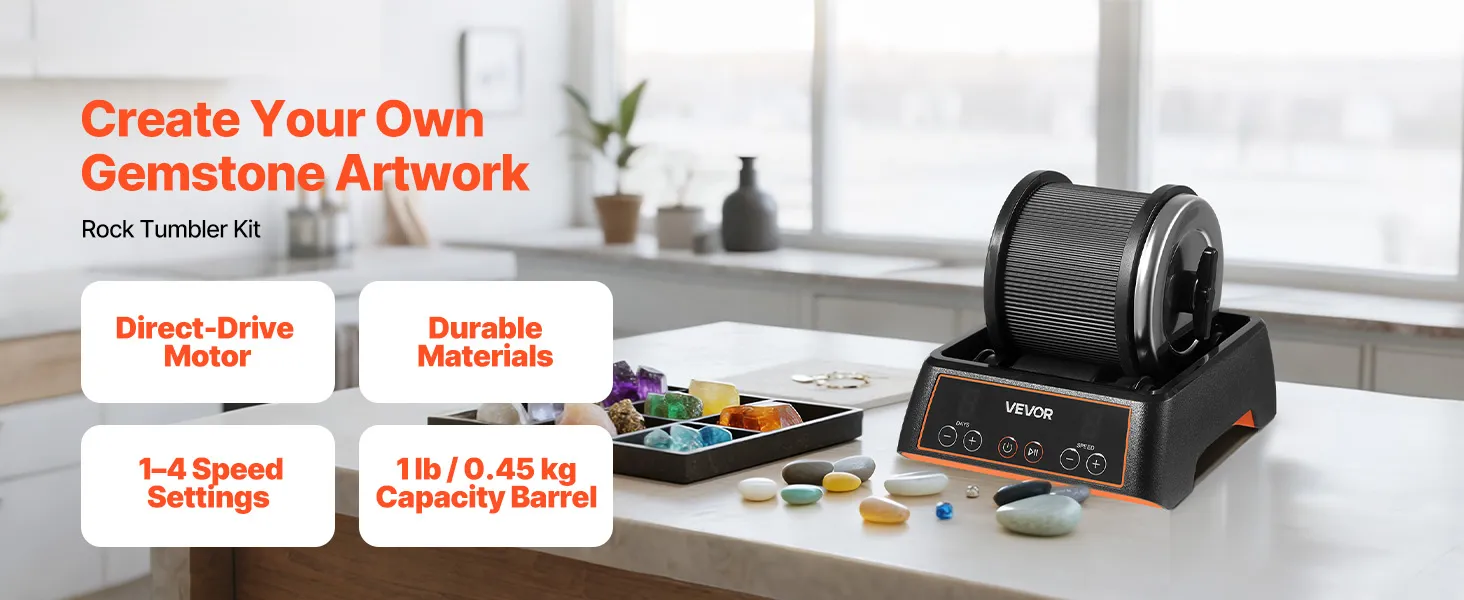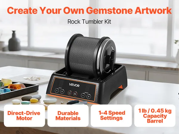 VEVOR Rock Tumbler, 0.45kg Rock Polishing Machine, Rocks Tumbling Kit with 4-Speed Adjustment, 1–9 Day Timer, Direct Drive Motor Rocks Polishing Kit for Rose Quartz, Amethyst, Red Jasper, Lapis Lazuli