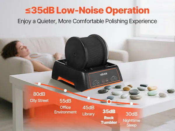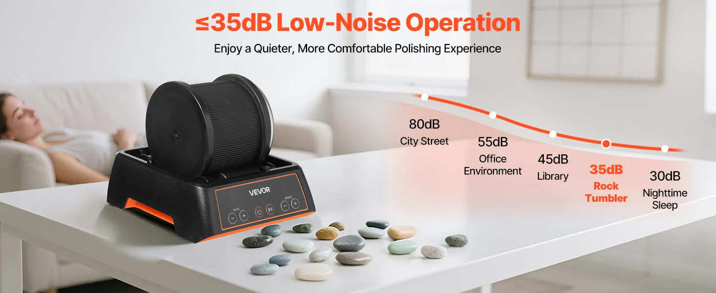 Direct-Drive Technology: Experience quiet, efficient polishing with this stone tumbler machine. Its belt-free direct-drive motor replaces traditional belts for steady operation. Running at ≤35dB, it reduces noise, lowers maintenance needs, and lets you focus on turning rough stones into polished gems