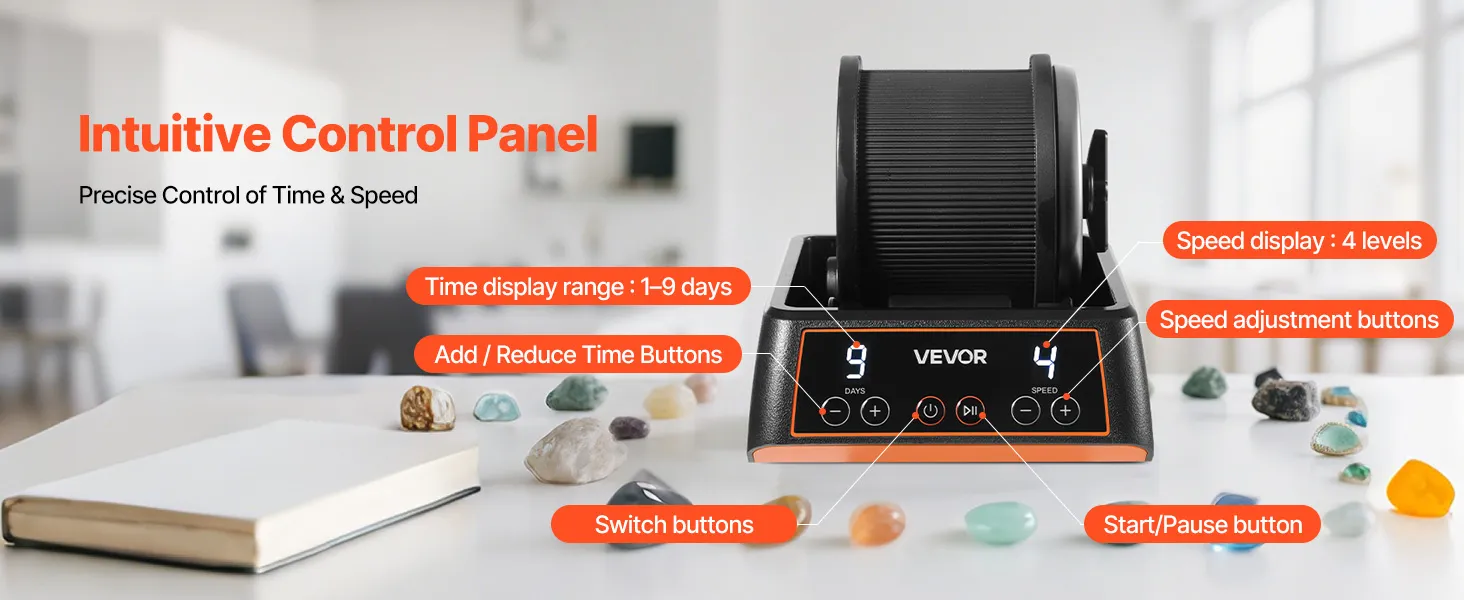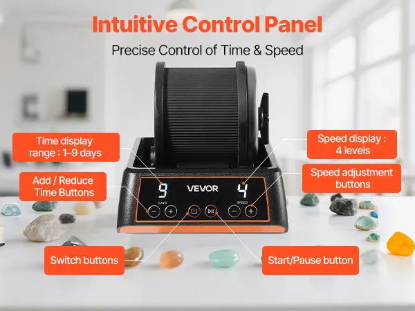 Flexible Speed Settings: This rock polisher features a 1–9 day timer and 1–4 speed settings ranging from 75 to 120RPM. Overload and power memory functions resume operation after interruptions, while constant-speed design ensures uniform polishing for various materials and stages