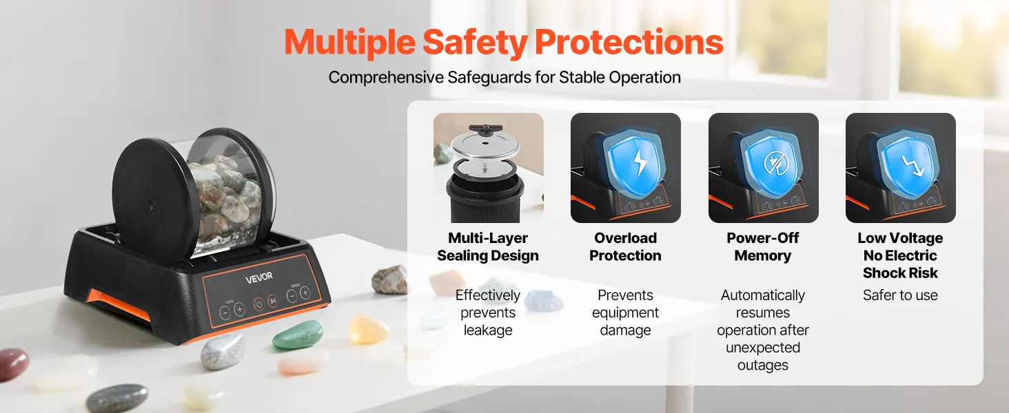 Equipped with advanced safeguards, this rock tumbler kit runs steadily and quietly. Its multi-sealed drum avoids spills, overload protection maintains motor function, and power memory resumes work after outages, giving users confidence and smooth operation for all polishing tasks.