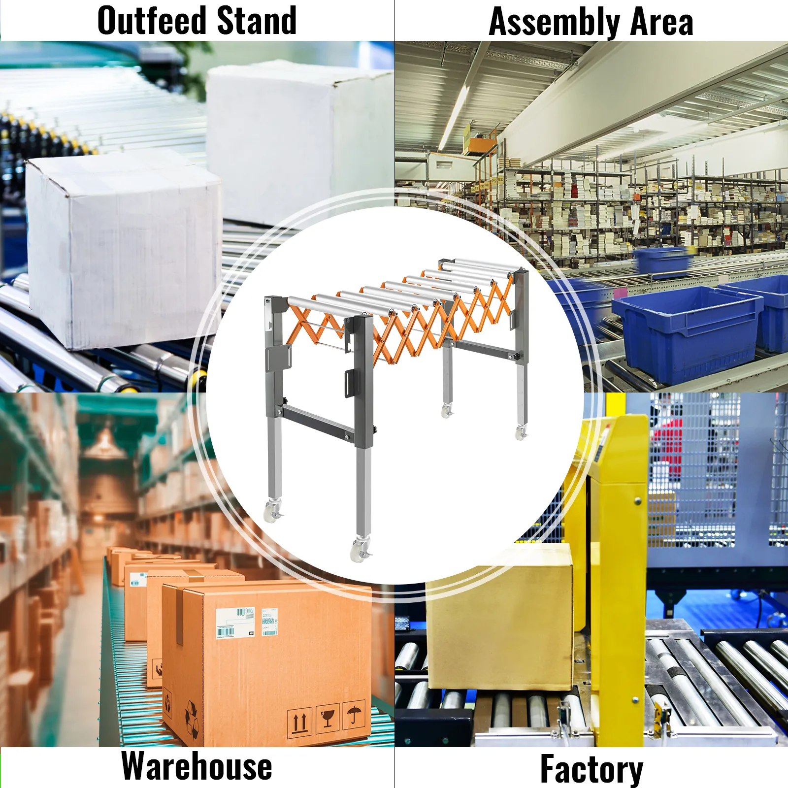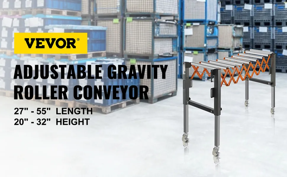 Our gravity conveyor is equipped with a steel frame and nine galvanized steel rollers, allowing permanent and temporary transportation works. With adjustable length & height, 110 lbs load capacity, it is ideal for handling various items in warehouses, factories, assembly areas, and many more.