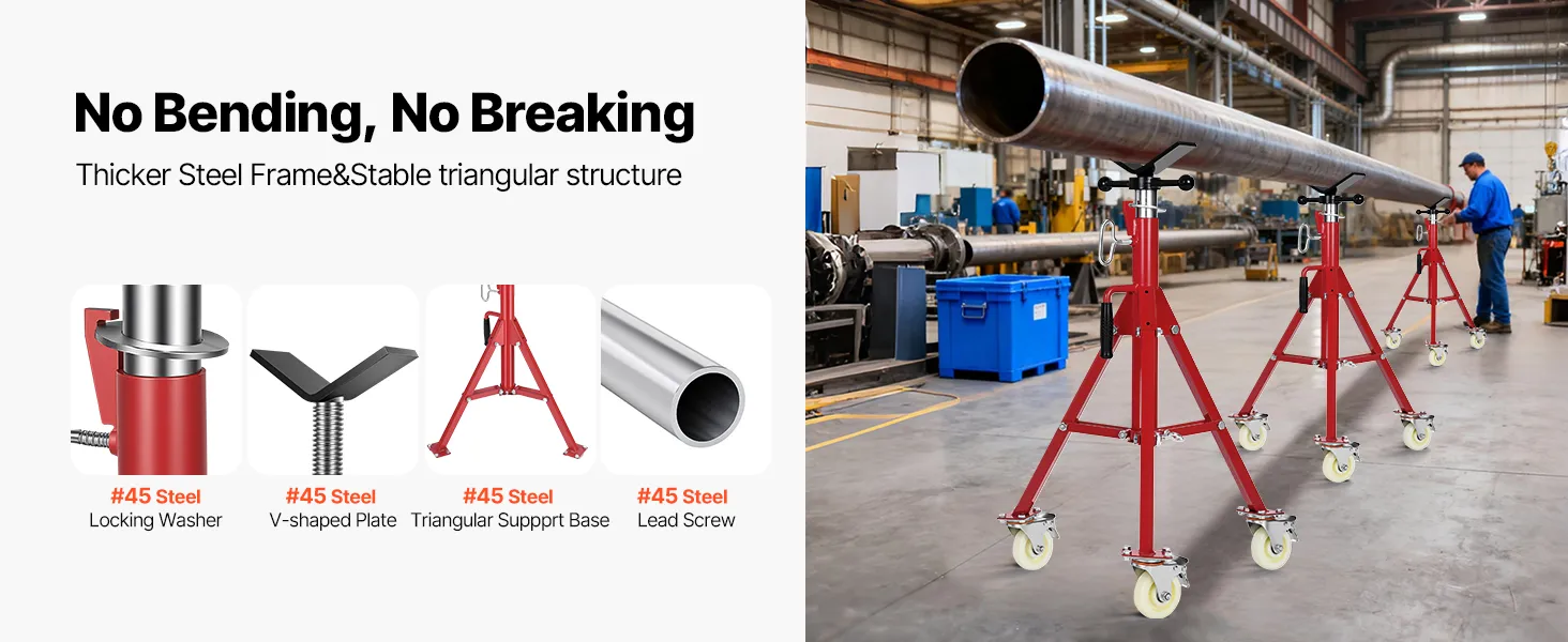 The VEVOR pipe stand improves safety by providing a stable base. This reduces the risk of accidents. The stand is also designed to hold pipes, preventing them from rolling or falling securely. It ensures a safer working environment. Also, the adjustable height enhances efficiency. You can work at a comfortable level, reducing strain. That allows you to work longer and more productively. The stand's sturdy construction adds to its safety features. They can handle heavy loads without compromising stability. So, it creates an efficient and safer workspace.