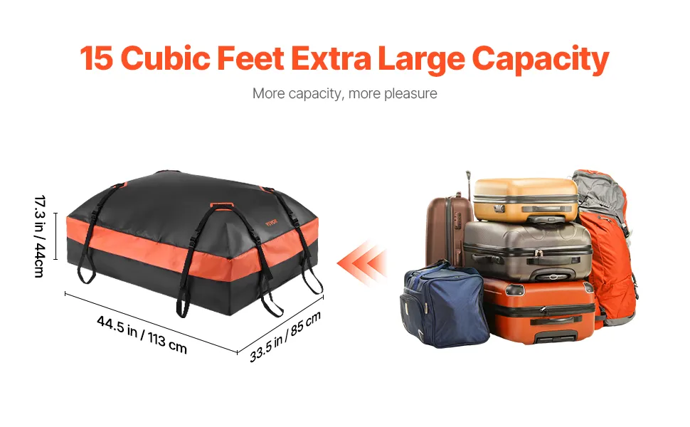 Large Storage Capacity: Measuring 44.5" x 33.5" x 17.3", this 15 cubic feet roof cargo carrier offers ample room for sleeping bags, luggage, tents, and more. It's the perfect storage solution for road trips, camping, or family vacations, ensuring a more comfortable and enjoyable journey.