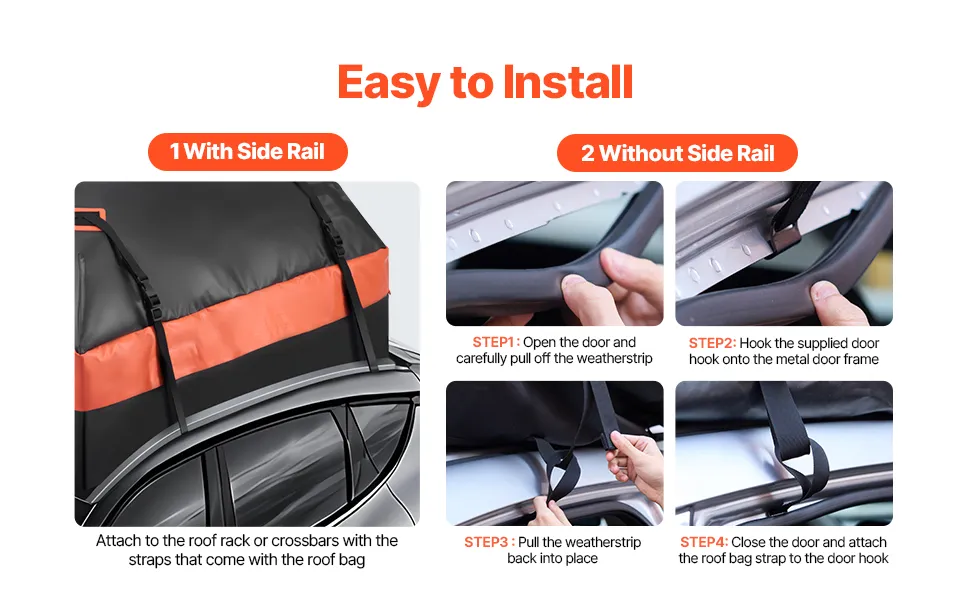 Easy to Install - Whether your vehicle has a roof rack or not, this car roof luggage carrier can be securely attached using straps or the included door hooks, ensuring a quick and hassle-free setup.