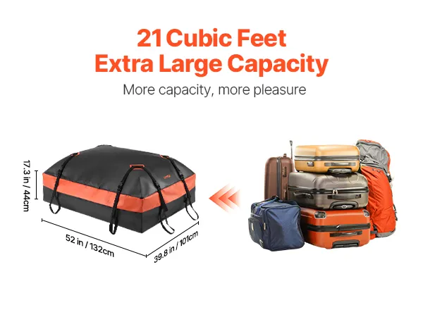 Large Storage Capacity: Measuring 52" x 39.8" x 17.3", this 21 cubic feet roof cargo carrier offers ample room for sleeping bags, luggage, tents, and more. It's the perfect storage solution for road trips, camping, or family vacations, ensuring a more comfortable and enjoyable journey.