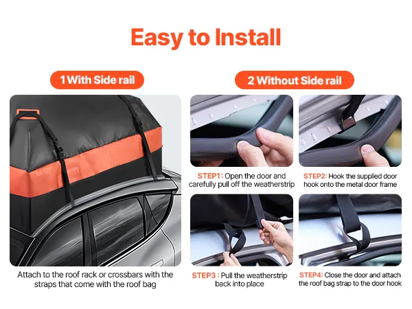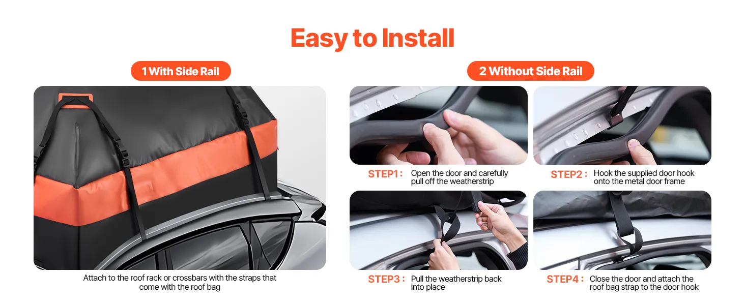Easy to Install - Whether your vehicle has a roof rack or not, this car roof luggage carrier can be securely attached using straps or the included door hooks, ensuring a quick and hassle-free setup.